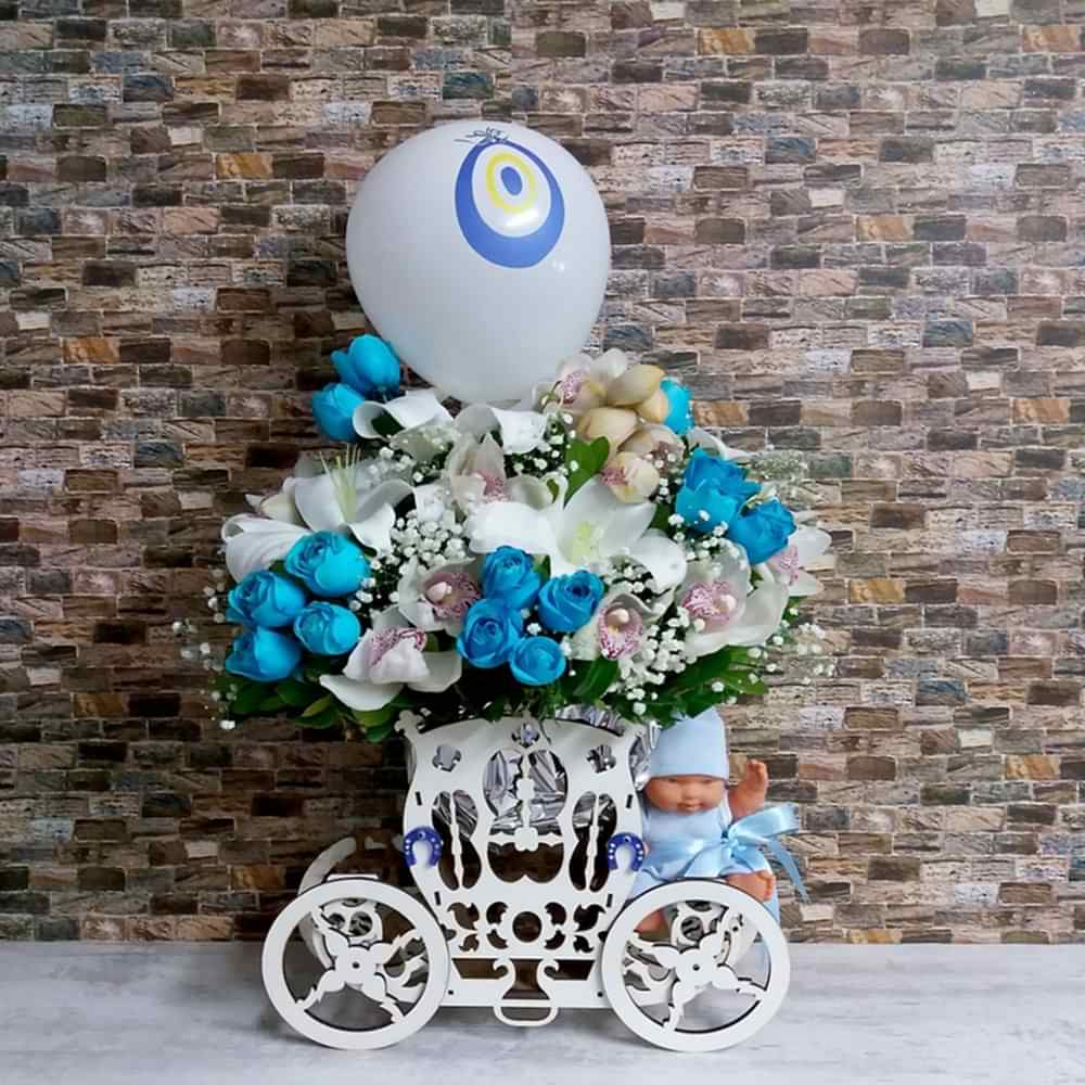 Ahşap fayton içerisinde yeşillik, 1 adet nazar boncuğu balon,1 adet et bebek ile süslenmiş kesme dal orkide, kazablanka ve 16 adet mavi gül bulunan bebek doğum çiçeği.