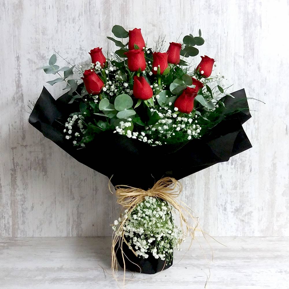 Siyah tela kullanılarak cipso ve yeşilliklerle süslenmiş doğal rafya ile sarılmış 10 adet kırmızı gül buketi.