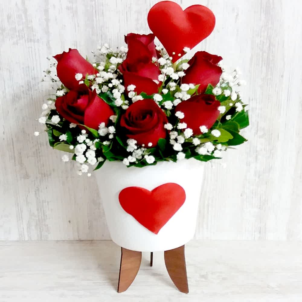 Ayaklı kalpli seramik içerisinde cipso ve yeşilliklerle süslenmiş 7 adet kırmızı gül, 1 adet kalp çubuğu bulunan ürün.