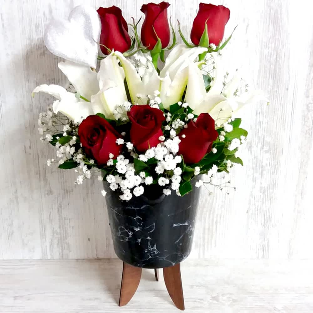 Ayaklı siyah mermer görünümlü seramik içerisinde cipso ve yeşilliklerle süslenmiş 6 adet kırmızı gül, 3 dal kazablanka, 1 adet beyaz kalp çubuğu bulunan ürün.