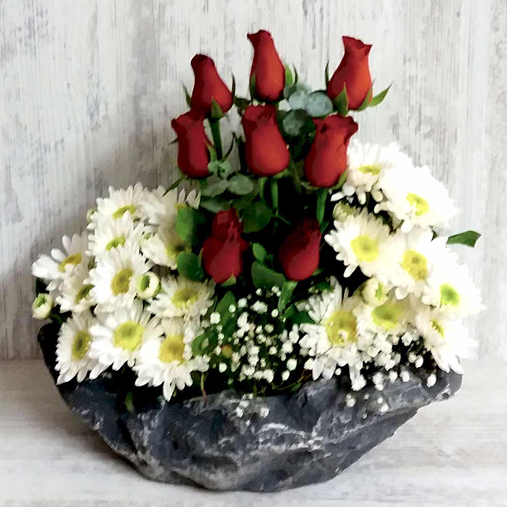 Taşta cipso ve yeşilliklerle süslenmiş papatyalar, 8 adet kırmızı gül bulunmaktadır.