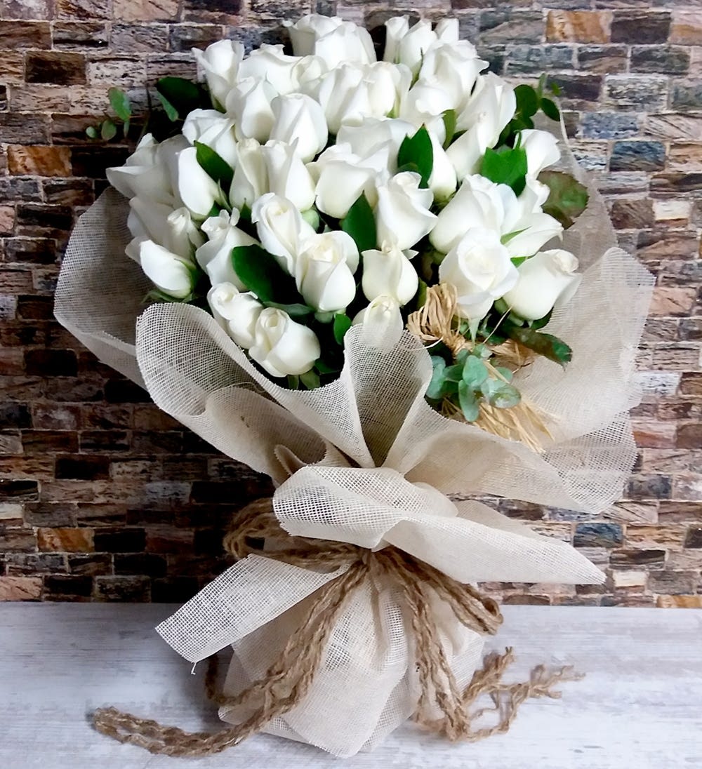 Sevdiklerinize zarif bir hediye armağan etmek istiyorsanız kalın tüle sarılmış 50 adet beyaz güllerle hazırlanmış buketimiz sizleri bekliyor.