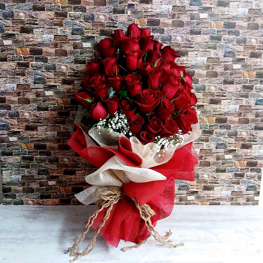 Kırmızı beyaz kalın tüle sarılmış cipso ve yeşillikler ile hazırlanmış 50 adet kırmızı gül buketimiz sizleri bekliyor.
