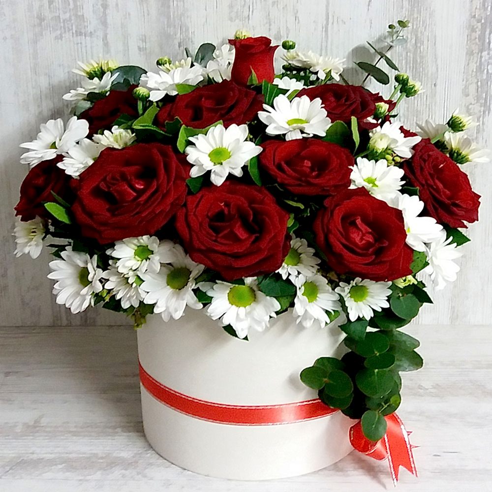 Beyaz oval kutu içerisinde yeşillik ve papatyalarla süslenmiş 10 adet kırmızı gül bulunmaktadır.