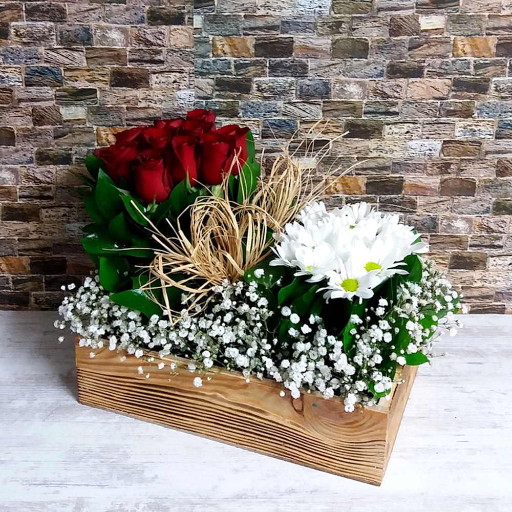 20cm en 30 cm boy olan şık ahşap altlık içerisinde 26 adet papatya 10 adet kırmızı kaliteli güllerle hazırlanmış ürünümüz.