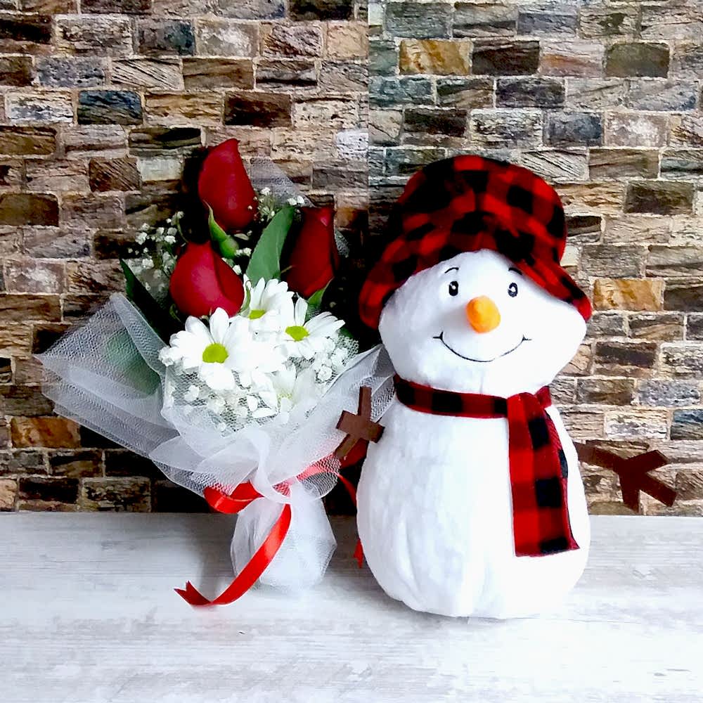 25 cm boyunda peluş kardan adam ve cipso,papatyalar 3 adet kırmızı gül bulunan mini buketle birlikte sevdiklerinize hediye edebileceğiniz şirin ürün.