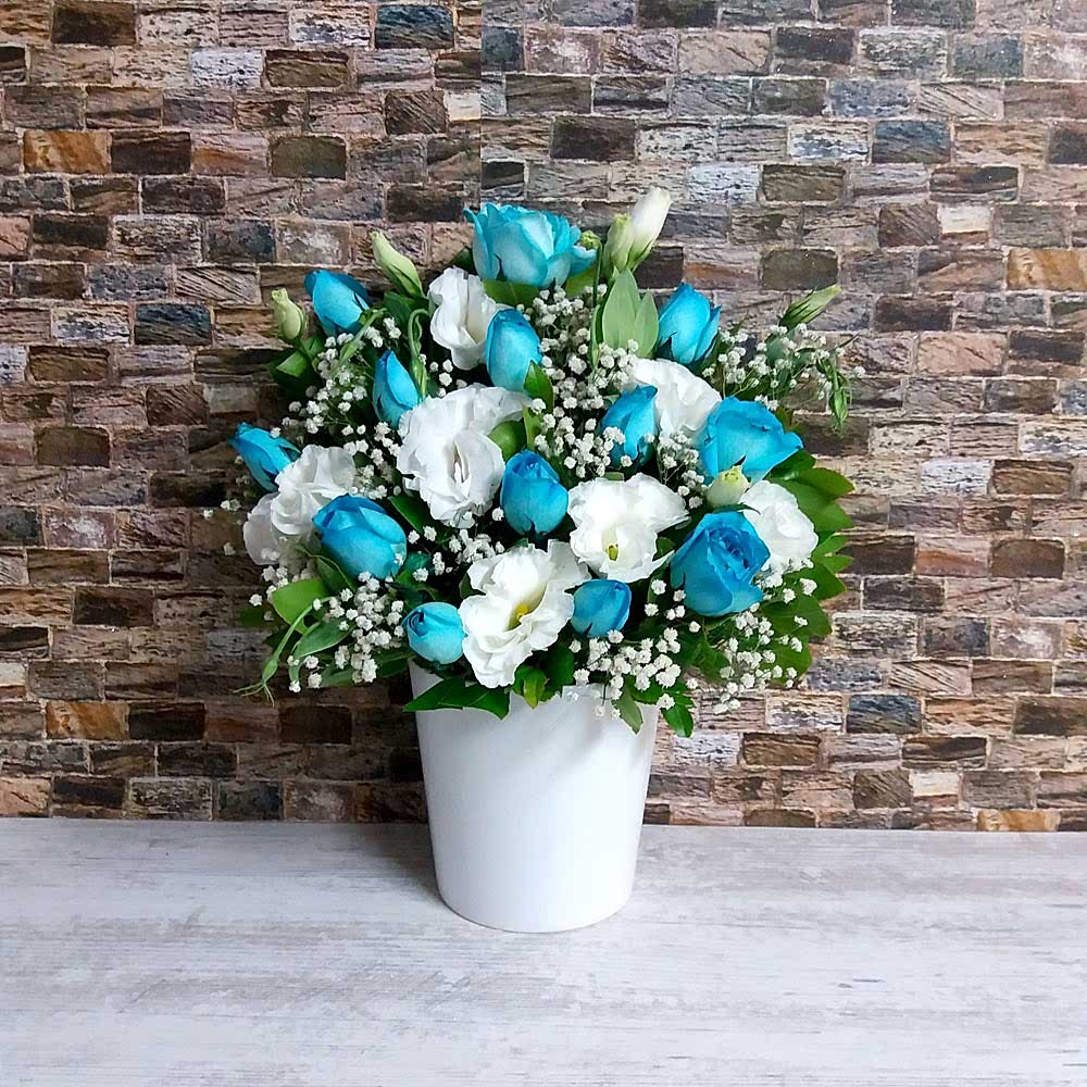 Beyaz seramik içerisinde 13 adet mavi gül , 7 kandil beyaz lisyantus bulunmaktadır.