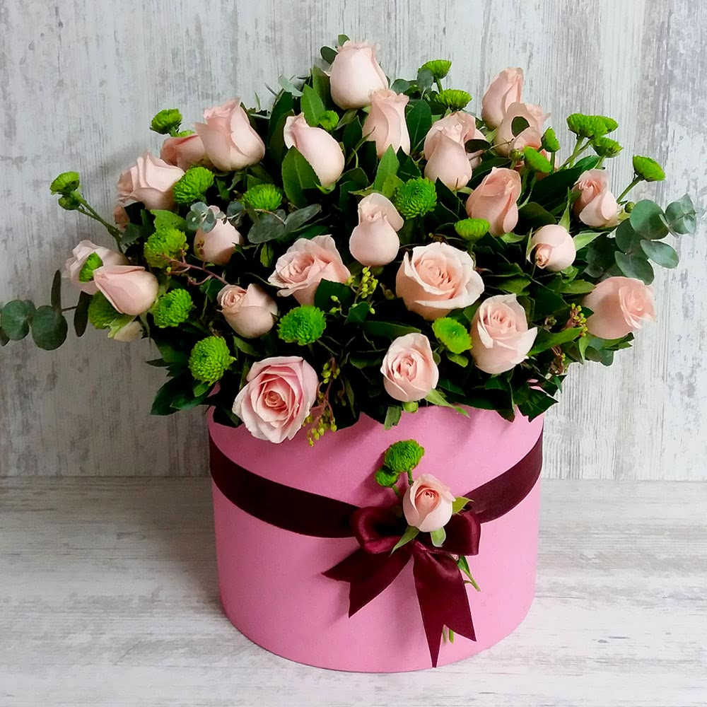 Pembe oval kutu içerisinde yeşilliklerle süslenmiş 30 adet pudra rengi gül bulunmaktadır.