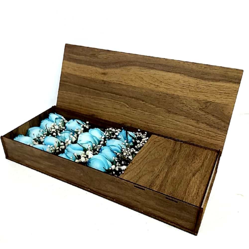 Love yazılı ahşap kutu içerisinde cipsolarla süslenmiş 16 adet mavi gül. kutu boy 34 cm,genişlik 16,derinlik 7 cm dir