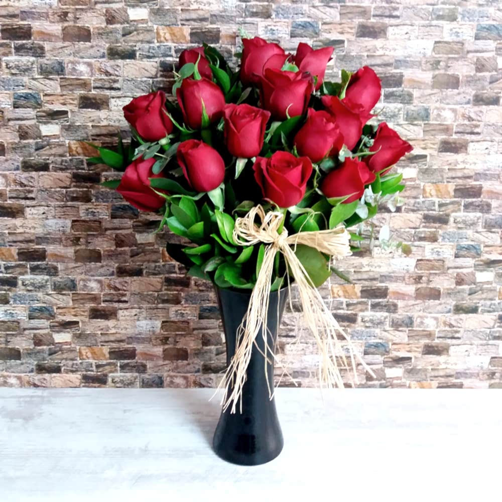 Siyah silindir cam voza içerisinde yeşilliklerle süslenmiş 15 adet 1.sınıf kırmızı güller bulunmaktadır.