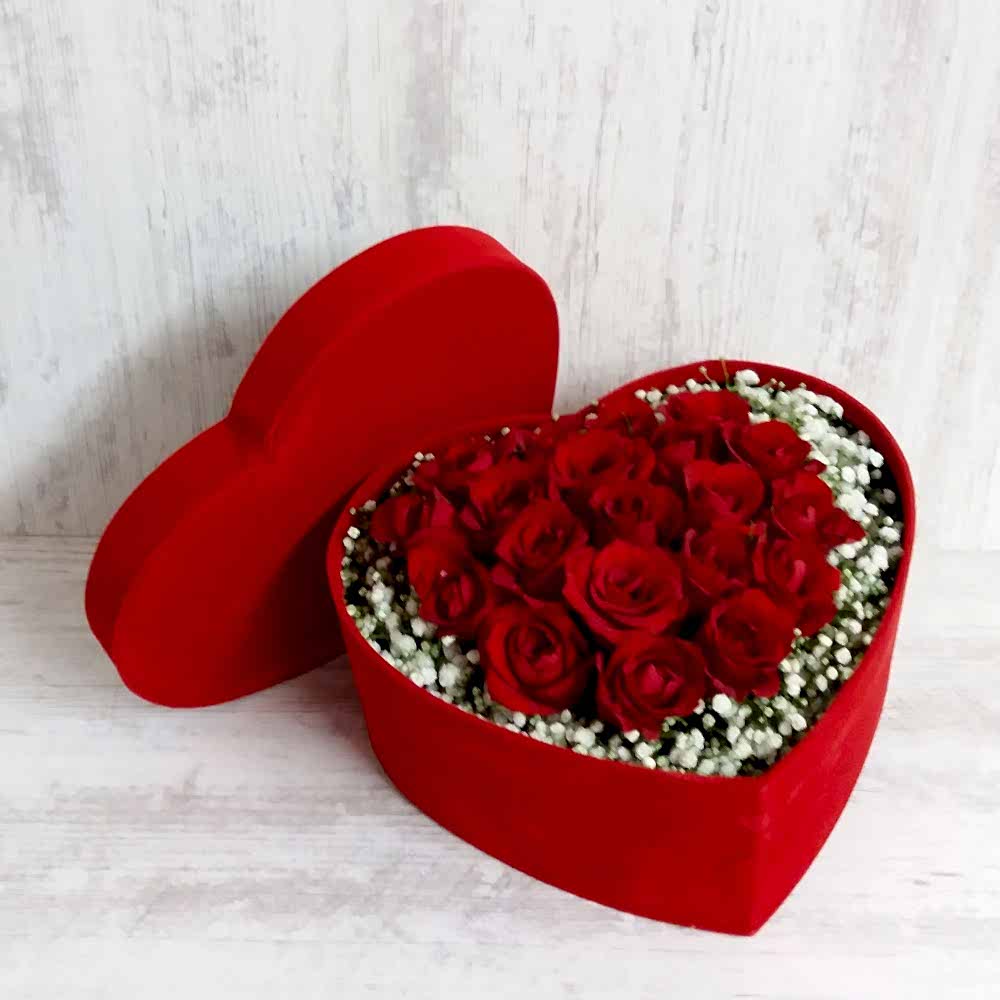 Büyük kalp kırmızı kadife kutu içerisinde cipsolarla süslenmiş 20 adet kırmızı gül bulunan romantik ürünümüz.
