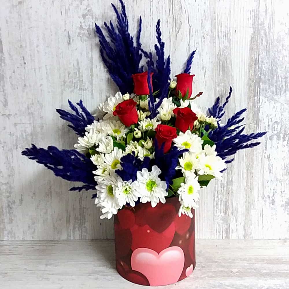 Kırmızı kalpli renkli kutu içerisinde 5 adet kırmızı gül,papatyalar ve mor panpaslar.