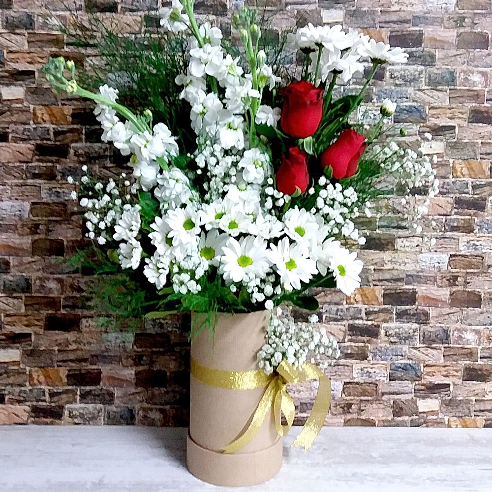 Kokulu slindir kutu içerisinde şebboy ve papatyalarla hazırlanmış 3 adet kırmızı gül bulunan ürün.
