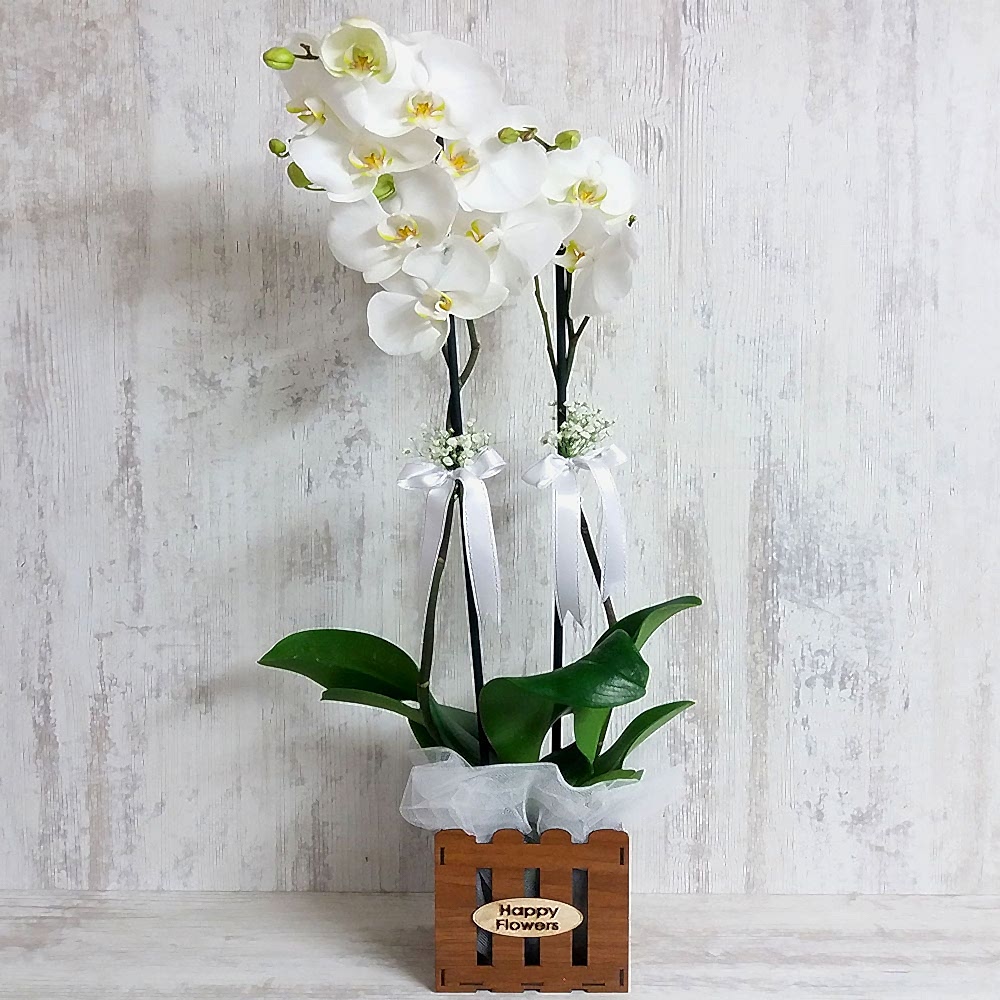 Ahşap saksı içerisinde çift dal beyaz orkide.