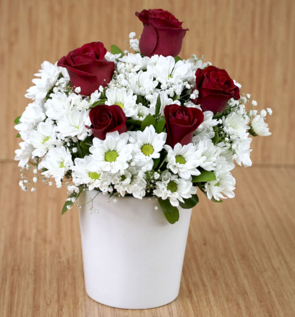 Seramik vazo içerisinde 20 adet papatya 5 adet kırmızı gül bulunmaktadır.