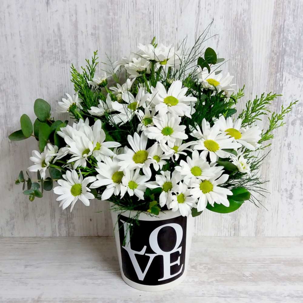 Love yazılı seramik içerisinde papatyalar..