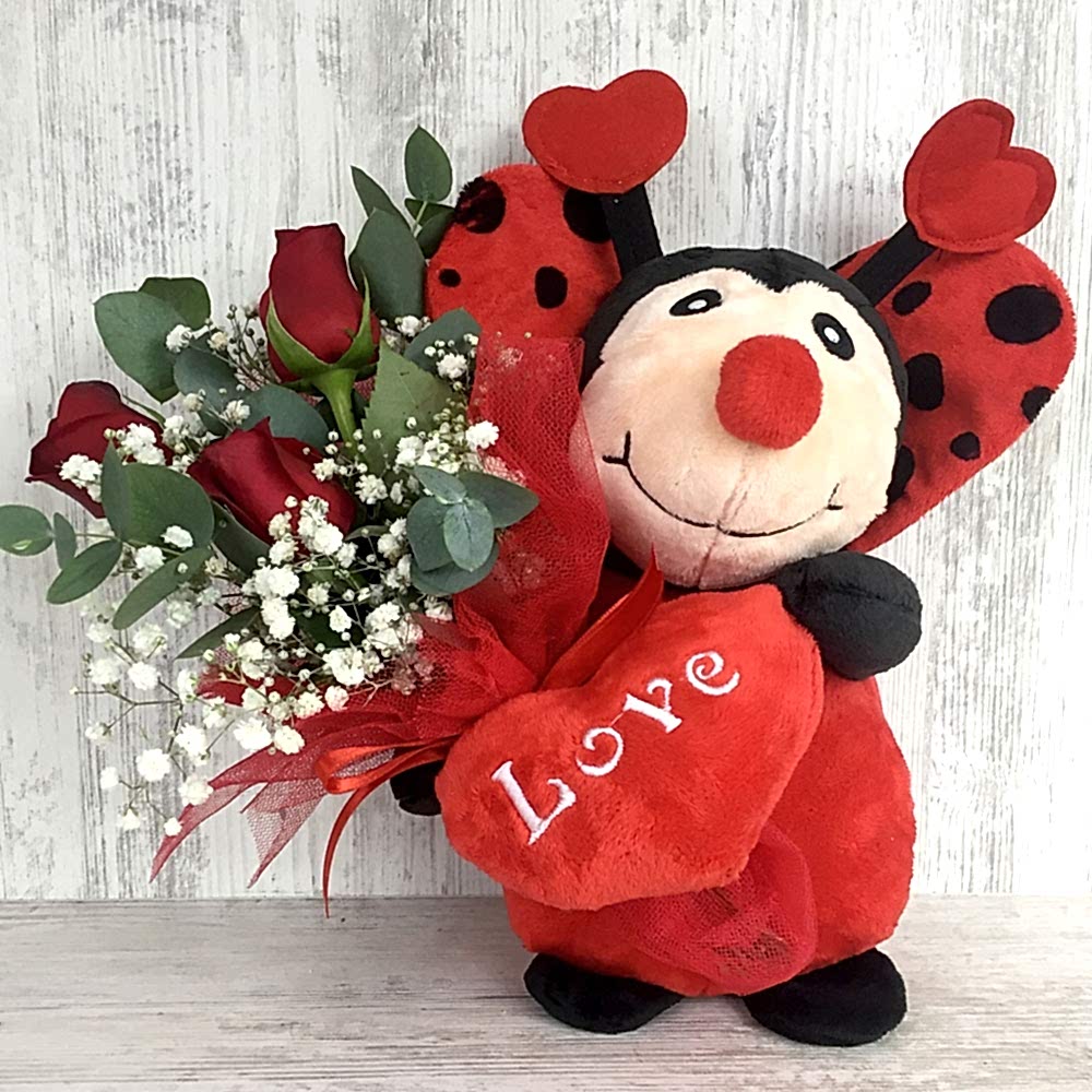28 cm peluş uğur böceğinde 3 adet kırmızı gül ve cipsolarla hazırlanmış sevimli hediye.