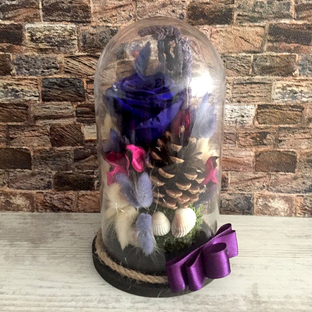Ufak cam ters fanus içerisinde 1 adet şoklanmış mavi gül ve kuru bitkiler,kuru çiçeklerle süslenmiş şık tasarım.