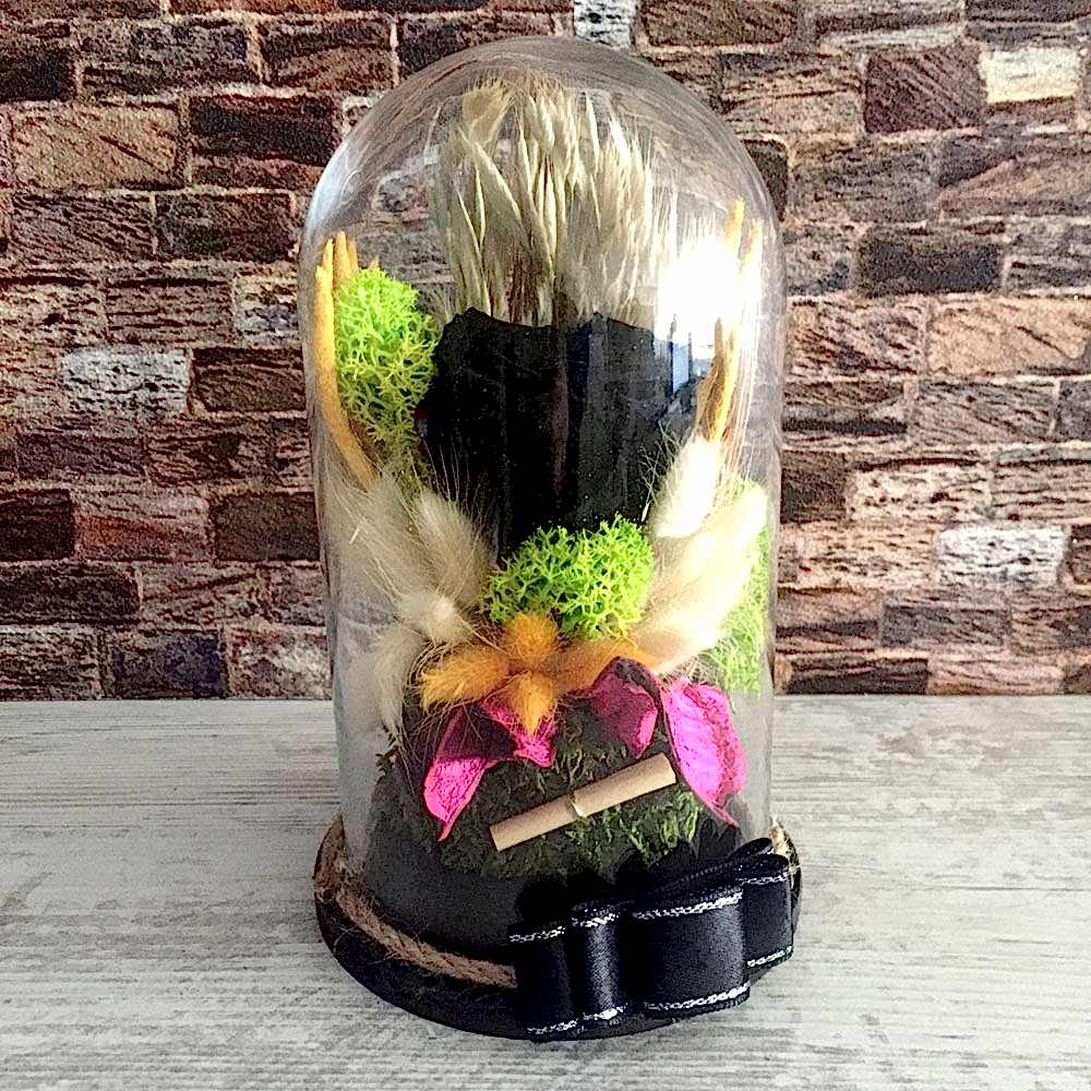 Ufak cam ters fanus içerisinde 1 adet şoklanmış siyah gül ve kuru bitkiler,kuru çiçeklerle süslenmiş şık tasarım.